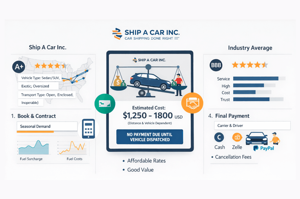 You need a clear picture of what your bank statement will look like after booking. Ship A Car Inc uses a tiered pricing model that fluctuates based on the logistics of your specific move.
