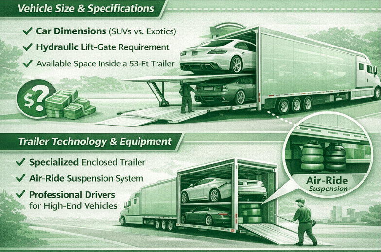 Finally, the trailer's technology also affects the price. You are paying for air-ride suspension, which absorbs road shock that a standard spring-ride trailer would pass directly to your car's frame. This specialized equipment, combined with professional drivers who only handle high-end metal, creates a higher car shipping cost than basic open carriers.