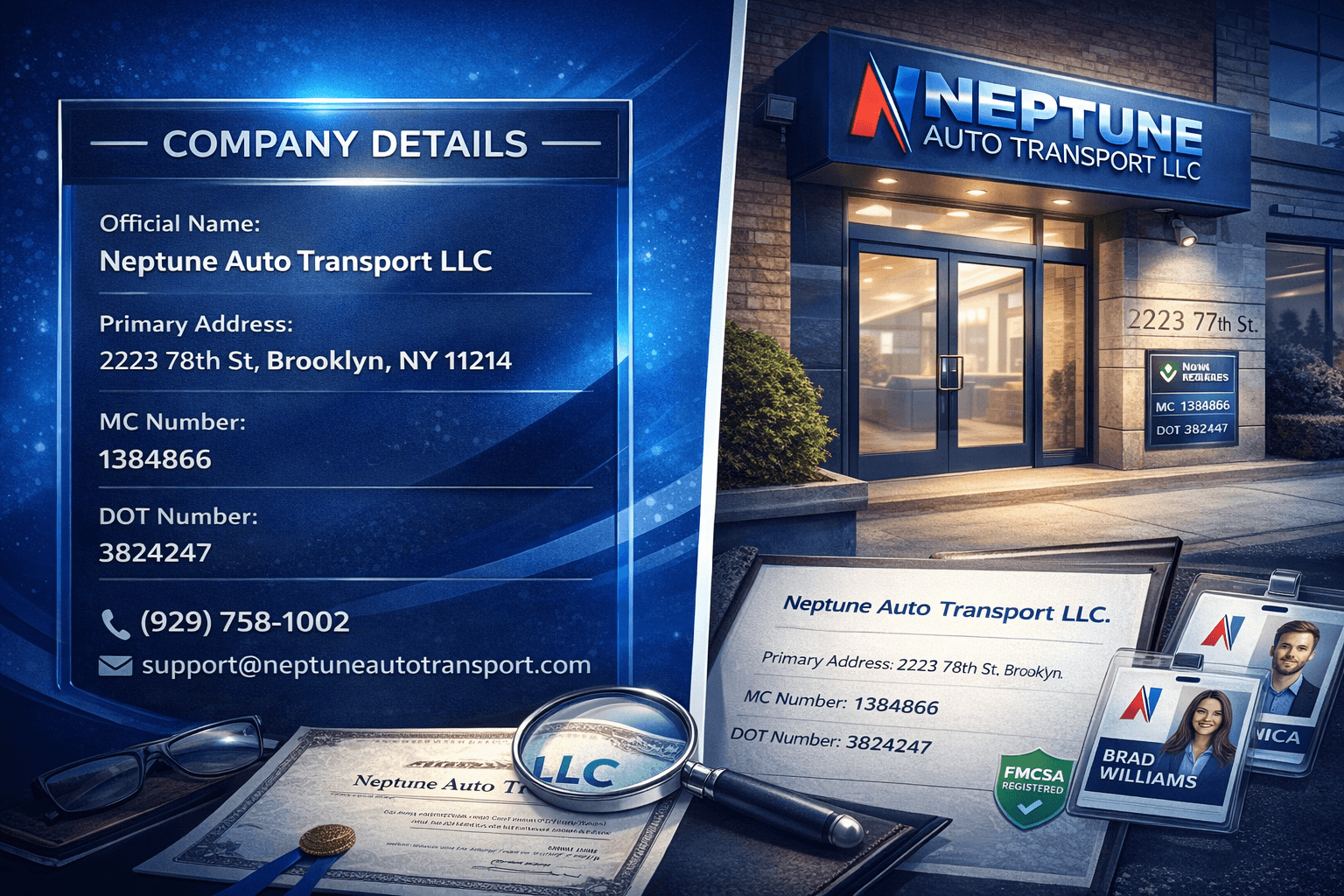 Verifying the legal identity of your broker ensures you are dealing with a legitimate business. Neptune Auto Transport LLC operates as a registered vehicle shipping agent based in New York.