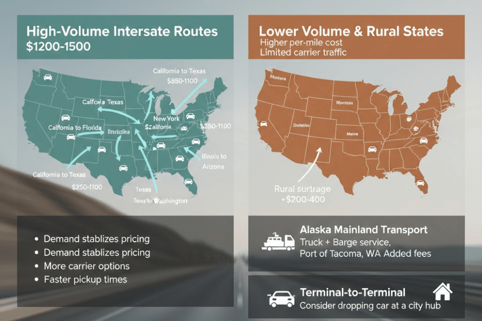 Shipping to or from states like Montana, Wyoming, North Dakota, or Maine changes the math. These areas have limited carrier traffic, which increases the cost to ship a car to another state.