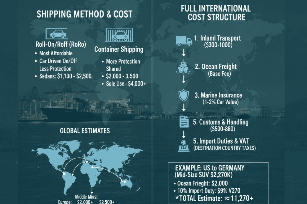 When looking at the shipping a car overseas cost for specific regions, expect to pay $1,200+ for Europe, $2,000+ for the Middle East, and $2,500+ for Asia. These base rates cover the ocean voyage but not the final taxes.