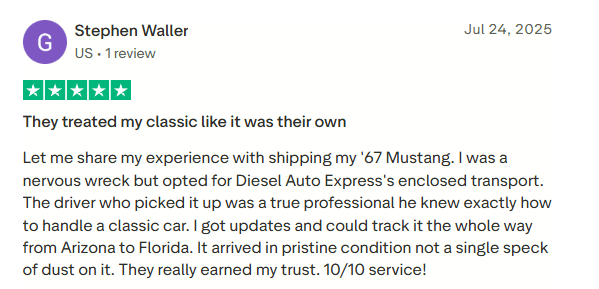 Your vehicle is covered by liability and cargo insurance from the moment of pickup until delivery. Diesel Auto Express provides insurance through their primary carrier status, which is a major benefit over smaller brokers who might leave you chasing a third-party driver.